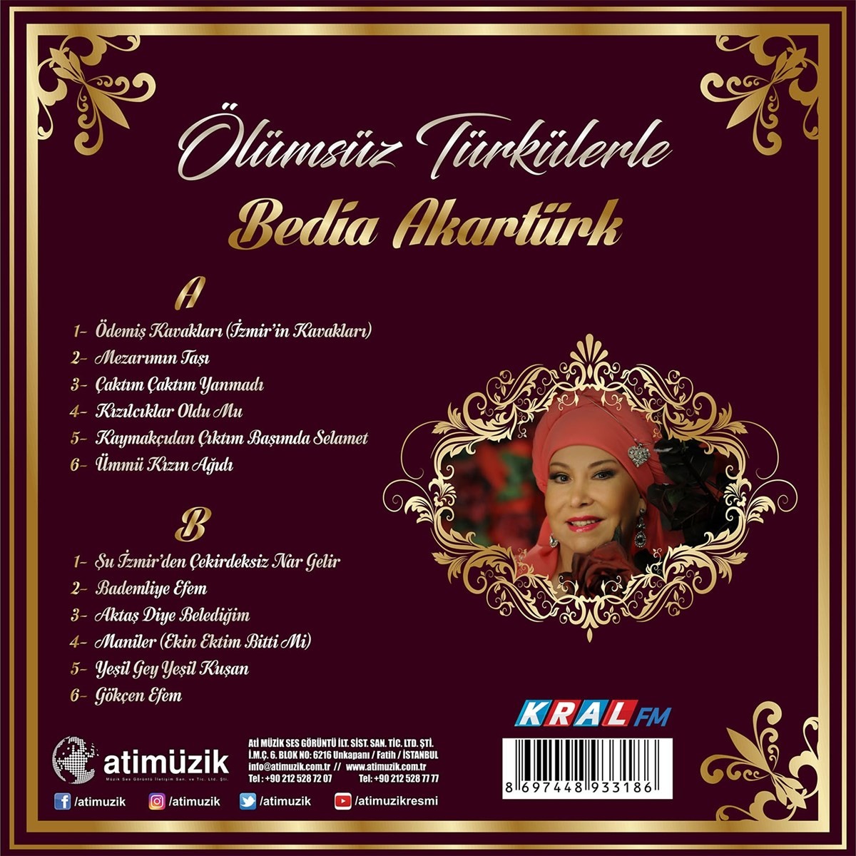 Türk Halk Müziğinin usta sanatçısı Bedia Akartürk KRAL MEDYA sponsorluğunda açılır kapak tasarımı ile Ölümsüz Türkülerle isimli Plağı Ati Müzik etiketi ile müzik severlere sunuluyor. Bedia Akartürk Ölümsüz Türkülerle albümünde birbirinden değerli 12 adet türkü bulunmaktadır. Sanatçımız bu türküleri muhteşem sesiyle yorumlamıştır. Keyifli dinlemeler dileriz.