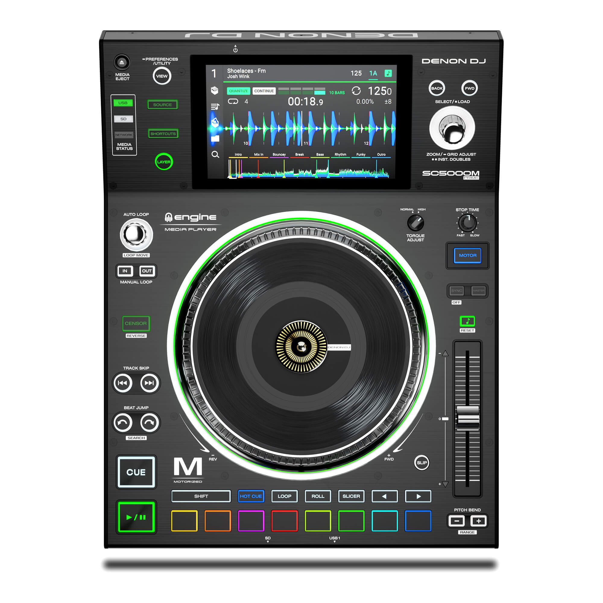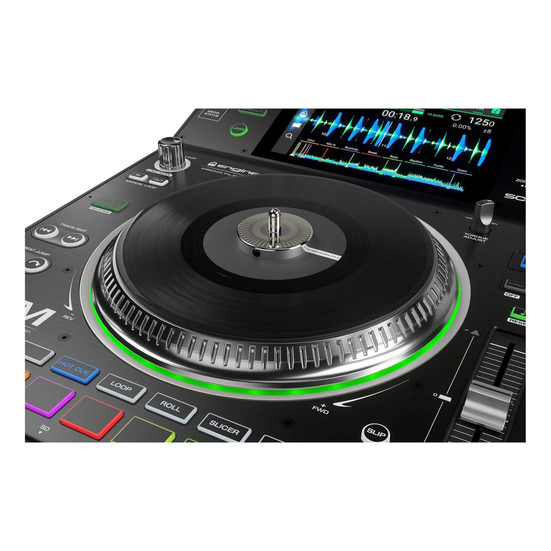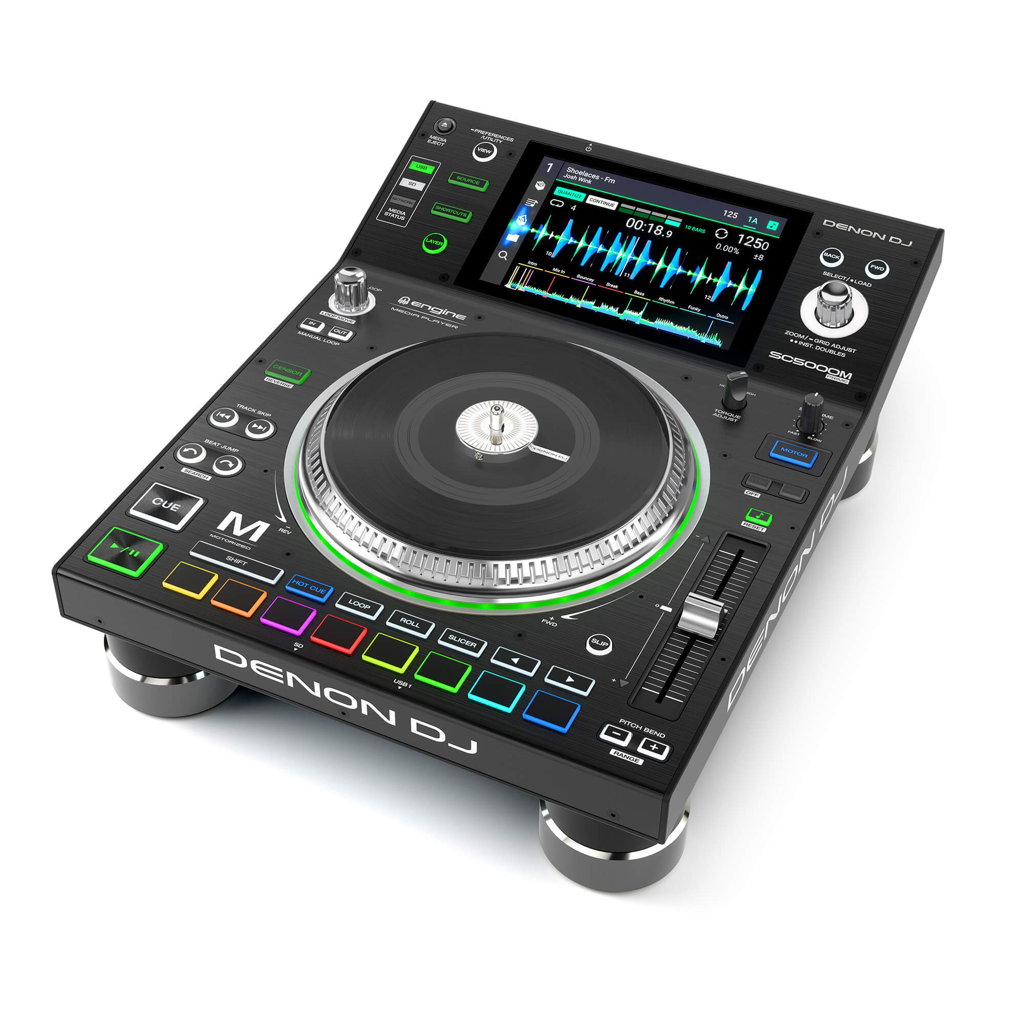 SC5000M ‘e özel olarak üzerinde bulunan sekiz çok fonksiyonlu trigger pad sayesinde hot-cue, loop, slice ve roll playback gibi işlemleri rahatlıkla yapabilirsiniz, üstelik SC5000M ‘in inanılmaz hassas ve doğru beatgrid analiz desteği ile. Dört adede kadar SC5000M LAN üzerinden tam senkron olarak birbirlerine data transferi yaparak çalışabilir, ek olarak Denon DJ’in yeni X1800 Prime 4 kanal mikseri ile “Engine Connect” protokulü üzerinden bağlanarak gelişmiş BPM ve FX imkanları sunar.