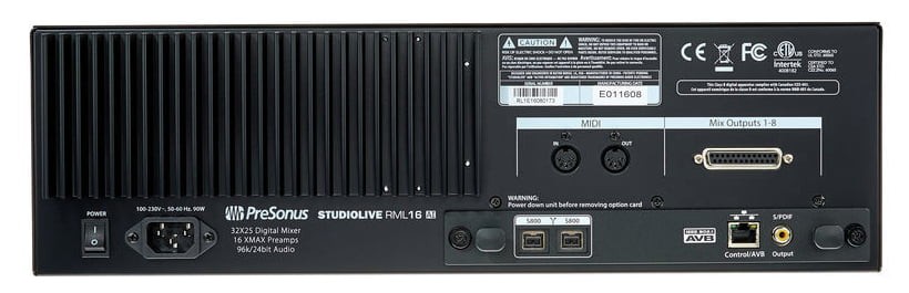 Canlı veya stüdyoda hem kayıt hem de miks yapabilmeniz için gerekli herşeyi 4U rack mount formatında size sunmaktadır. PreSonus StudioLive RML16AI üzerinde tümü ile recall (ayarları saklanabilen) edilebilen 32 adet XMAX Class A preamplifikatörü, AVB ve Dante network imkanı, farklı kontrol seçenekleri, 32 dahili kanal, 25 bus, üç ana çıkış ve 96 kHz destekli 52 x 34 FireWire ses kartı bulunmaktadır. Presonus’un en son teknolojisi kullanılarak tüm bu özellikler iOS cihazınız, Mac veya PC bilgisayarınız üzerinde çalışan UC-Surface touch kontrol yazılımı ile kontrol edilebilmektedir.