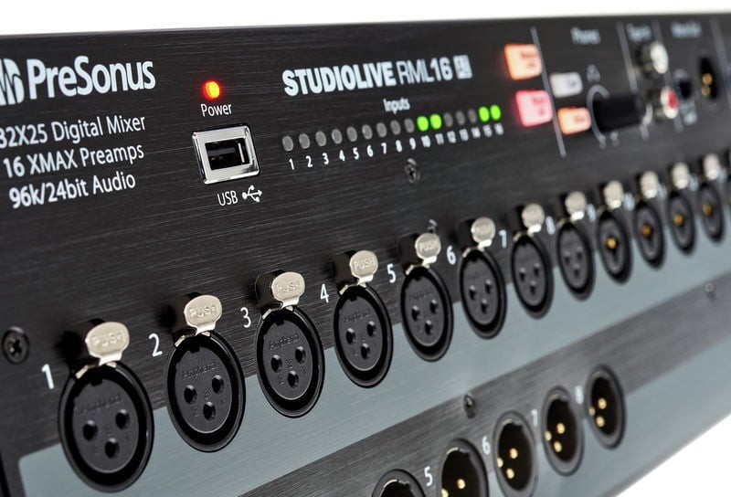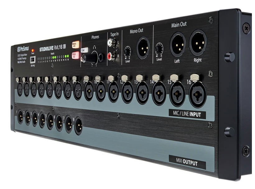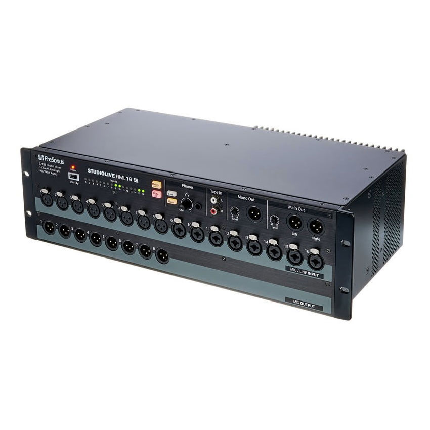 Presonus ihtiyacınız olan miks gücünü son derece kullanışlı bir şekilde sunmaktadır. Sadece 4U’luk bir boyutta istediğiniz anda kullanabileceğiniz stüdyo kalitesinde sound elinizin altındadır. Eski mikserinizi asla özlemeyeceksiniz; RML16AI ön paneli her ses mühendisinin ihtiyacı olan şeyleri -LED meter bridge, kulaklık çıkış, tüm XLR bağlantılar gibi- elinizin altına vermektedir. Çıkışlar konusunda da hiçbir kısıtlamaya gidilmemiştir; stereo ve mono mix bussları, monitor ve zone miksler için 16 aux çıkış kullanıma hazırdır.
