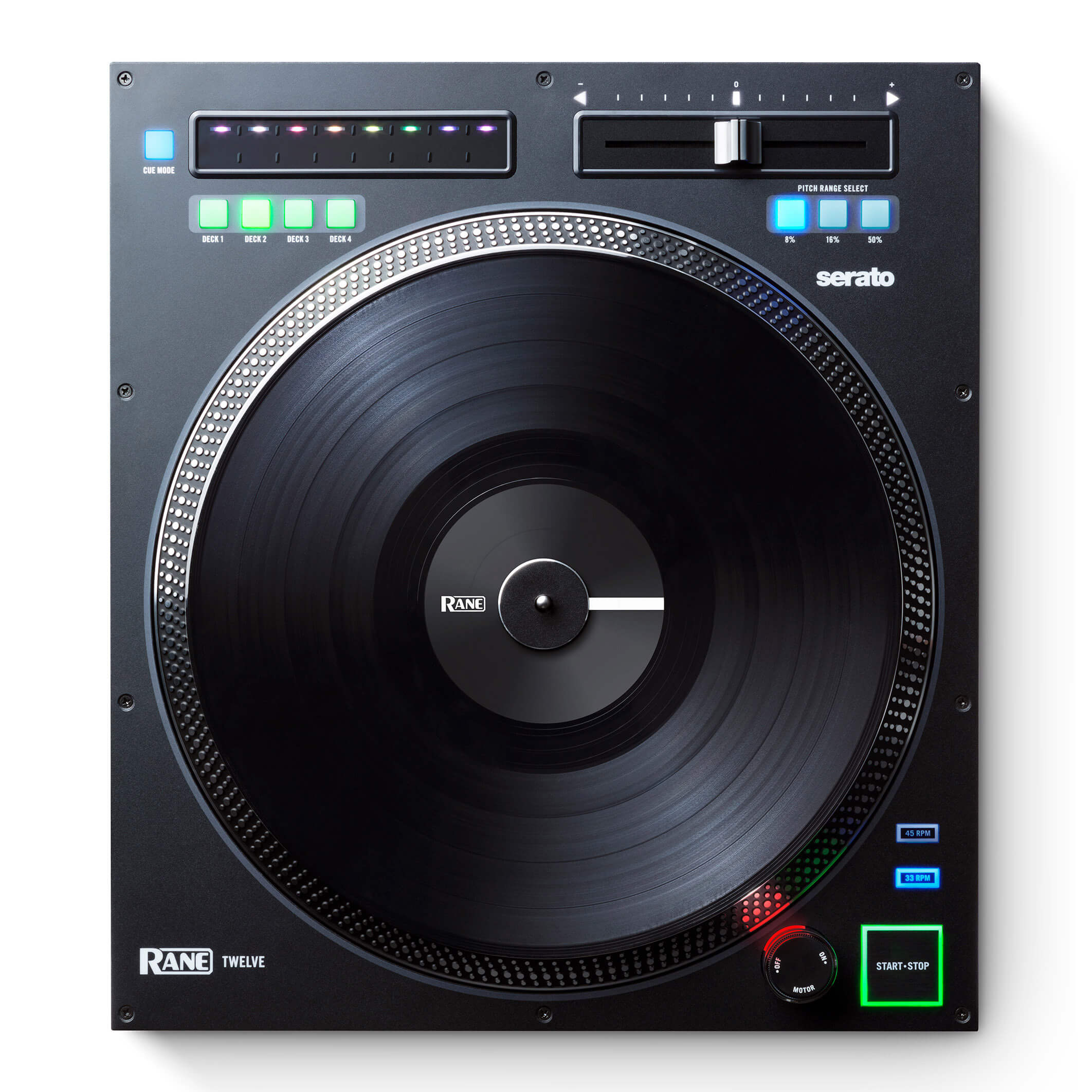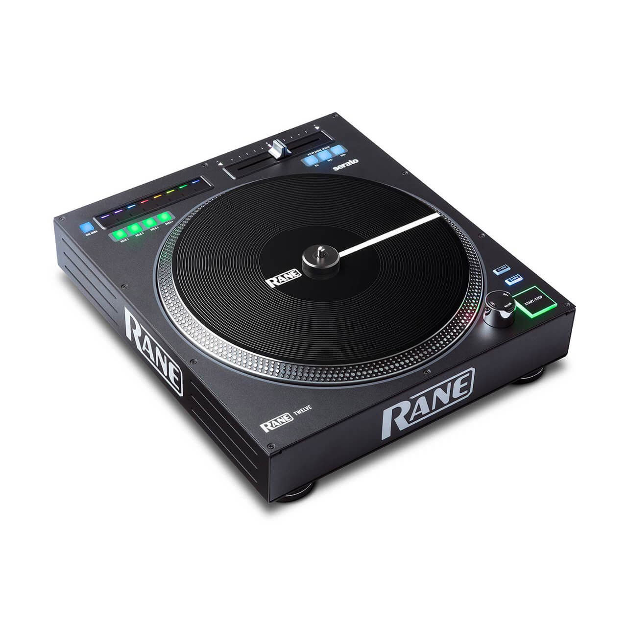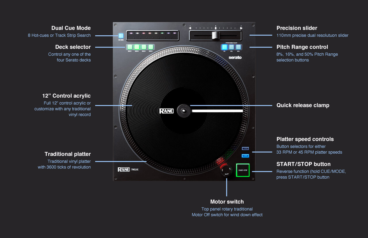 RANE TWELVE, bir vinil pikapta oynayan herhangi bir DJ’e anında tanıdık gelir ve parmağınızın dokunuşunda veya taramasında hot-cue ve parça arama özelliği ekler.